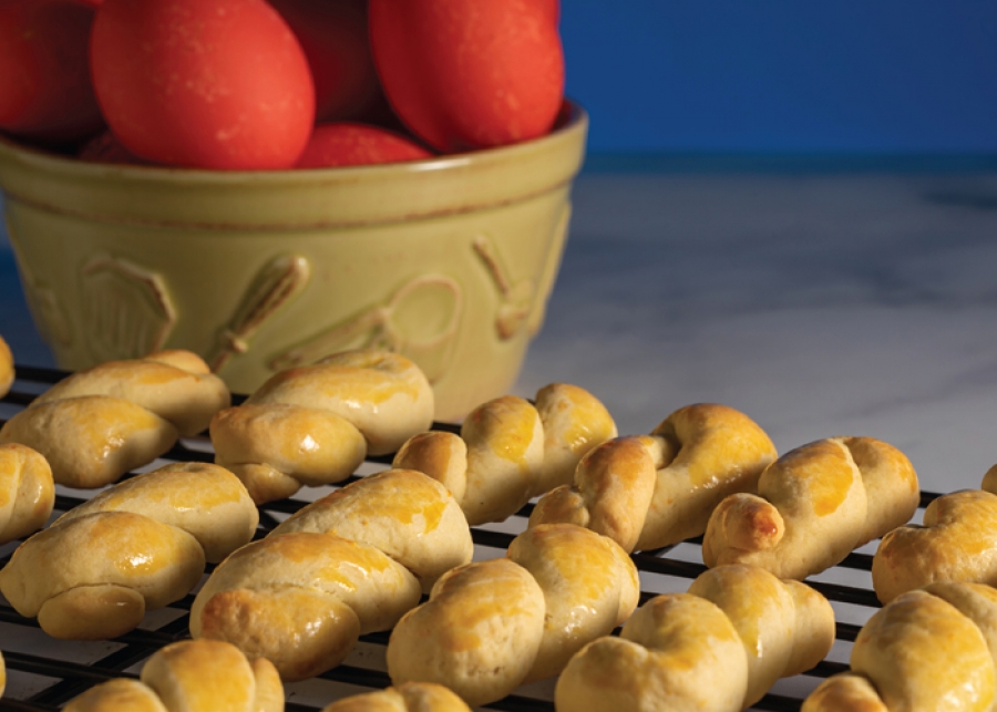 - Πλάθουμε τα κουλουράκια και τα τοποθετούμε σε ταψί που έχουμε στρώσει λαδόκολλα. Αλείφουμε την επιφάνεια τους με αυγό, αφού το έχουμε αραιώσει με λίγο νερό.